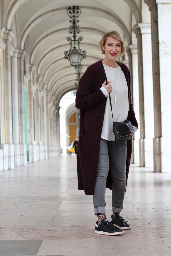 Meinen weinroten Cardigan gibt es bei &other Stories nur noch in Grau. Zalando hat einen in Beige und der weinrote Cardigan bei Breuninger gefällt mir auch. Damit das Outfit mit den Sneakers nicht all zu sommerlich wirkt, trage ich Netzsöckchen. Die schwarzen Adidas findet ihr bei Zalando. (Alles Affiliatelinks)